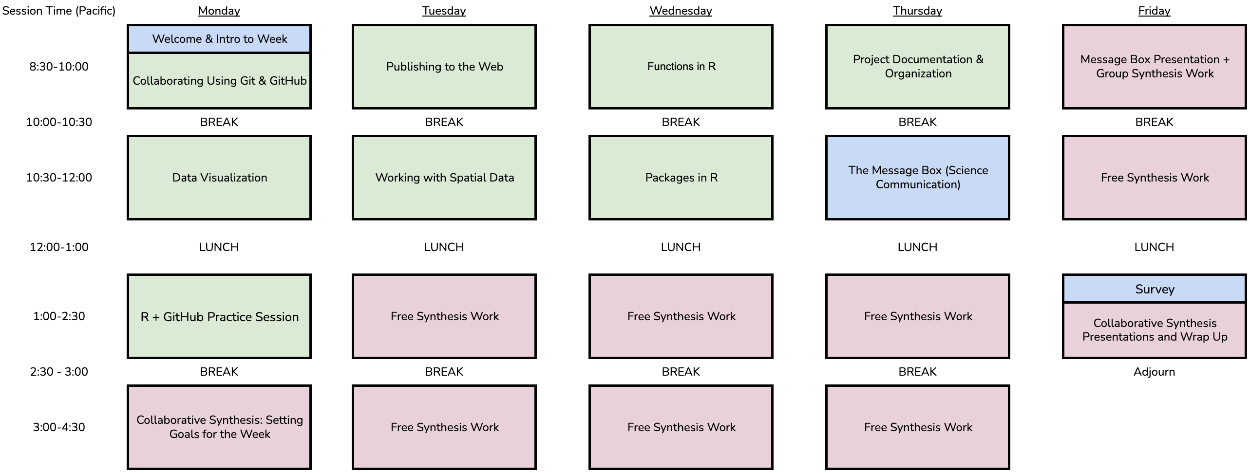 If you are participating in this workshop series, we are so excited to help you acquire new or hone existing technical and interpersonal skills in the realm of synthesis science! To ensure that you get the most out of this workshop series, please follow the instructions on the Pre-Workshop Prep page before the first week.