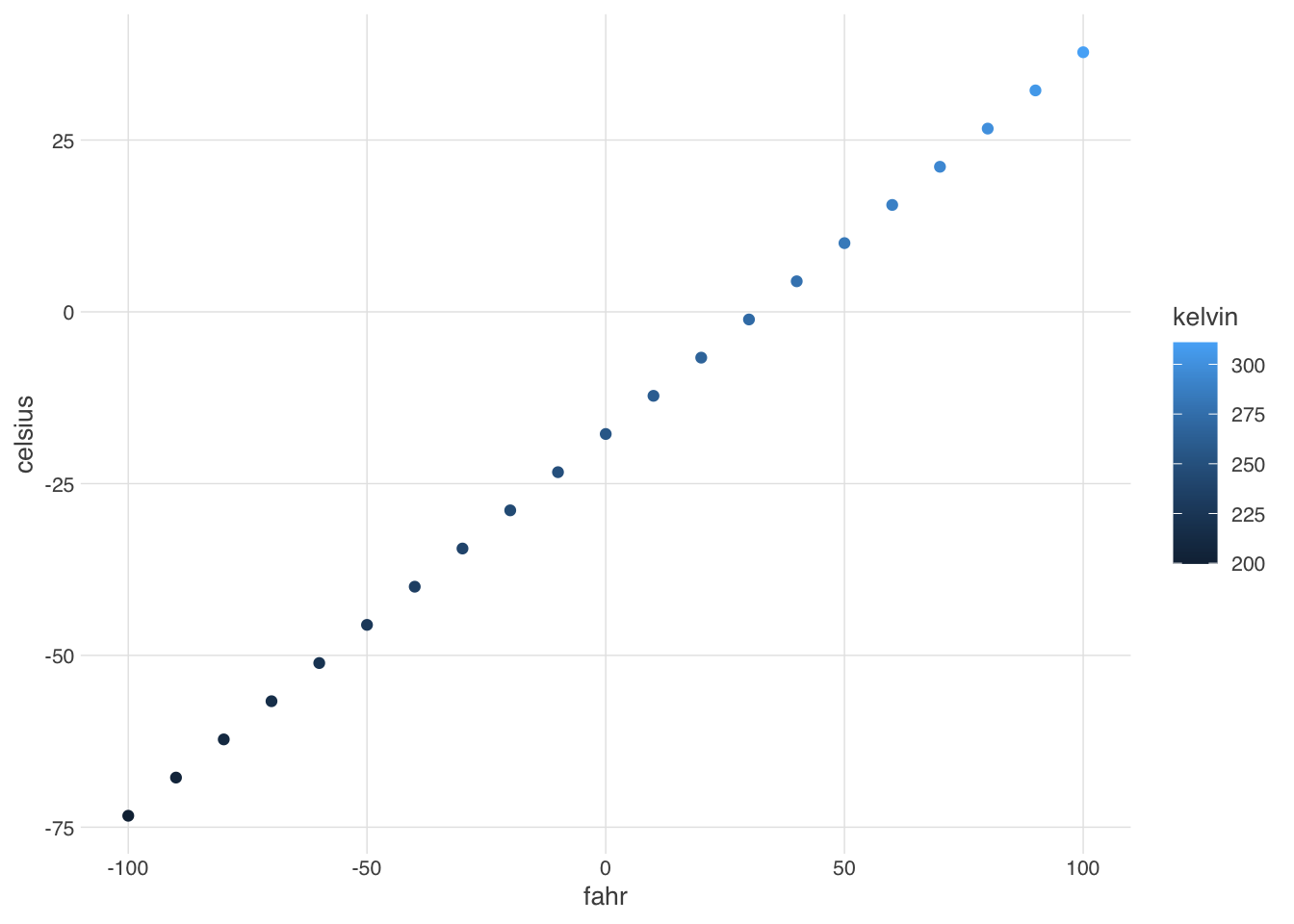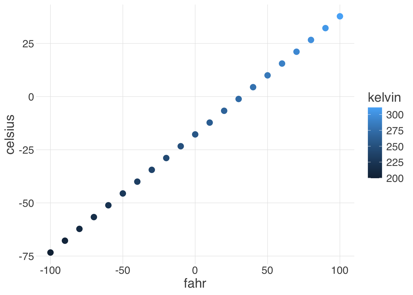 ggplot(df, mapping = aes(x = fahr, y = celsius, color = kelvin)) +