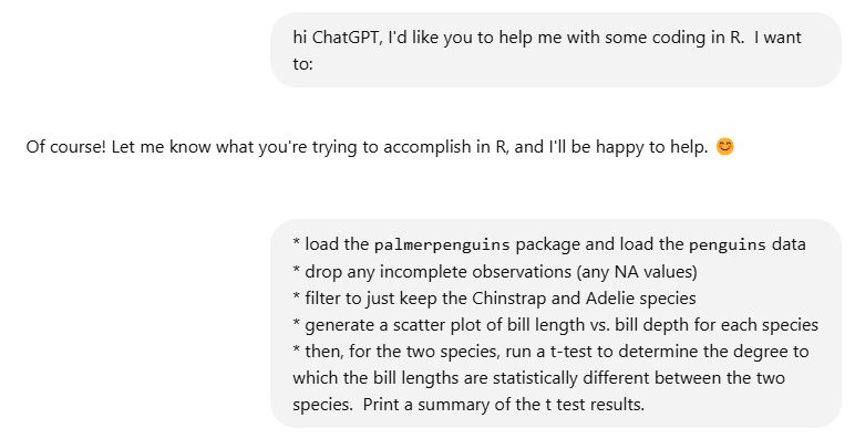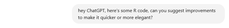 In this section we’ll look at using ChatGPT outside of RStudio. Here we can take existing code and feed it into ChatGPT and ask it to help us with various tasks, or feed pseudocode into ChatGPT and ask it to generate code for us. Rather than line by line, like Copilot, an LLM can often provide a more complete solution that can then be copied/pasted back into RStudio. It can also iterate through multiple rounds of conversation/prompts.
