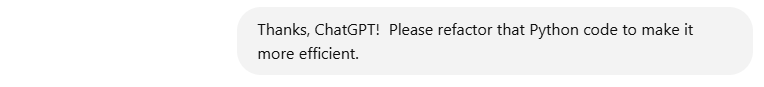 Let’s ask ChatGPT to take the nested for-loop above (a functional but not particularly elegant piece of code) and ask ChatGPT to recommend improvements.