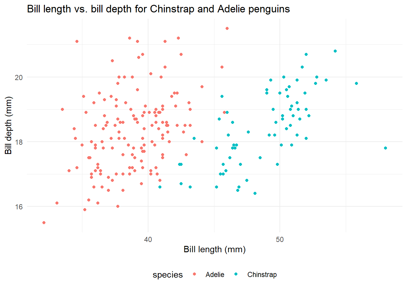 # Load necessary packageslibrary(palmerpenguins)library(ggplot2)library(dplyr)# Load the penguins dataset and remove incomplete observationspenguins_clean <- penguins %>%na.omit() %>%filter(species %in%c("Chinstrap", "Adelie"))# Generate scatter plot of bill length vs. bill depthggplot(penguins_clean, aes(x = bill_length_mm, y = bill_depth_mm, color = species)) +geom_point() +labs(title ="Bill Length vs. Bill Depth",x ="Bill Length (mm)",y ="Bill Depth (mm)") +theme_minimal()# Perform a t-test on bill length between Chinstrap and Adelie speciest_test_result <-t.test(bill_length_mm ~ species, data = penguins_clean)# Print summary of t-test resultsprint(t_test_result)