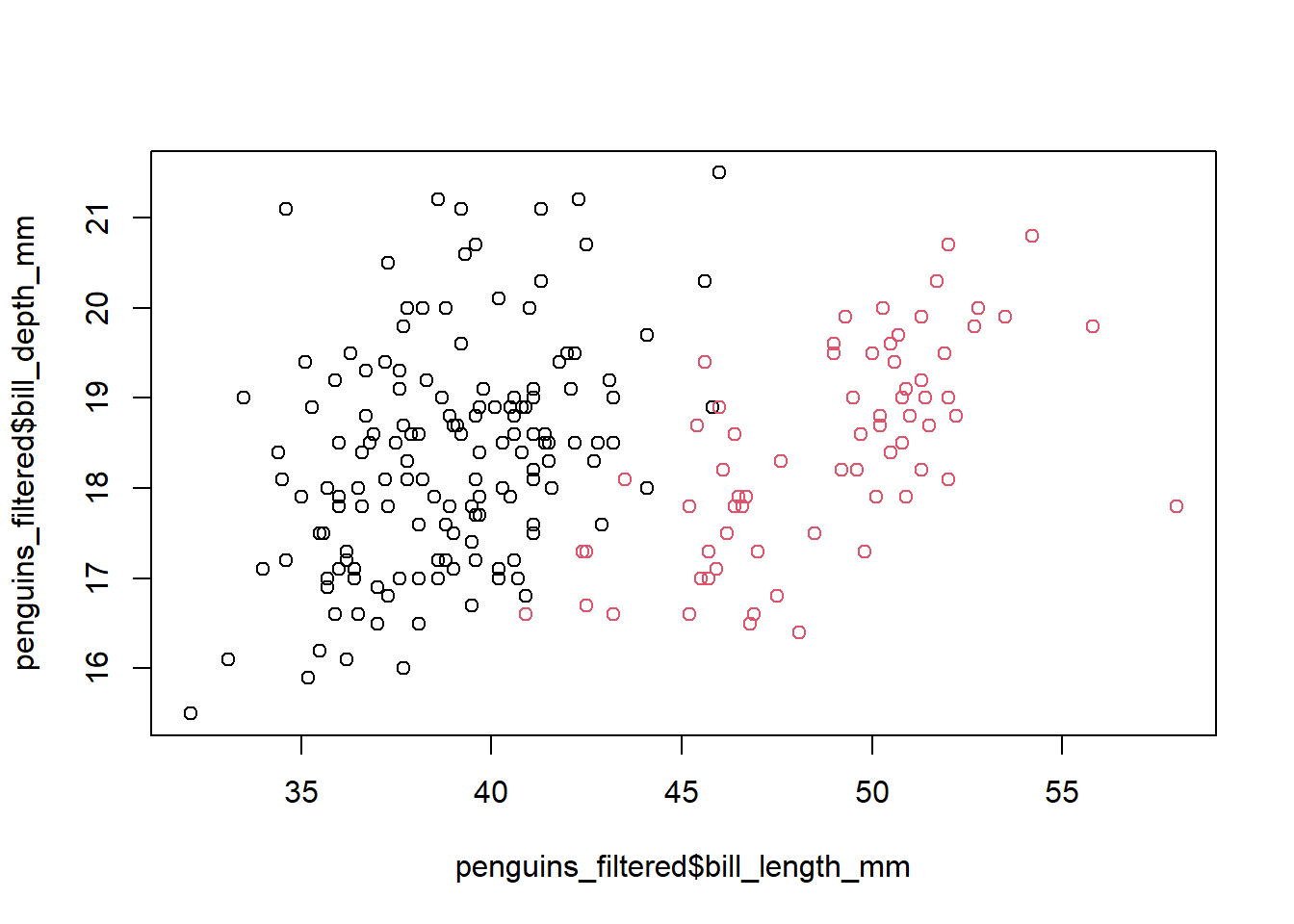 # Load the palmerpenguins packagelibrary(palmerpenguins)# Load the dataset and remove incomplete observationspenguins_clean <-na.omit(penguins)# Keep only Chinstrap and Adelie speciespenguins_clean <- penguins_clean[penguins_clean$species %in%c("Chinstrap", "Adelie"), ]# Generate scatter plot of flipper length vs. bill depthplot(penguins_clean$bill_length_mm, penguins_clean$bill_depth_mm,col =ifelse(penguins_clean$species =="Chinstrap", "blue", "red"),pch =19,xlab ="Bill Length (mm)",ylab ="Bill Depth (mm)",main ="Bill Length vs. Bill Depth")legend("topright", legend =c("Chinstrap", "Adelie"), col =c("blue", "red"), pch =19)# Perform a t-test on flipper length between Chinstrap and Adelie speciest_test_result <-t.test(bill_length_mm ~ species, data = penguins_clean)# Print summary of t-test resultsprint(t_test_result)