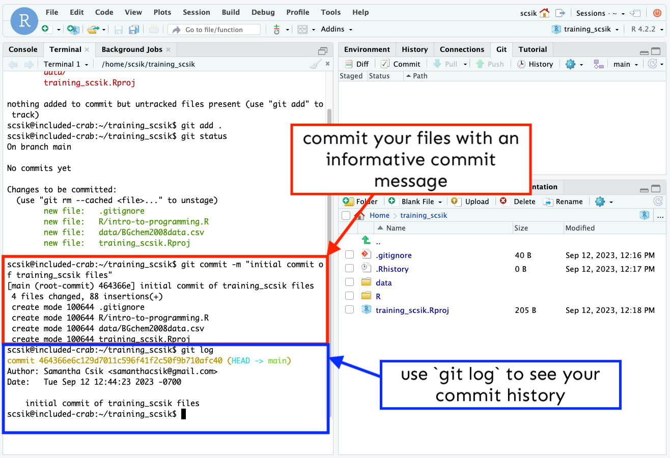 git commit -m "an informative commit message"in the Terminal. Refreshing your Git tab will cause them to disappear (just as they do when you commit using RStudio’s GUI buttons). You can rungit login the Terminal to see a history of your past commits (currently, we only have this one).