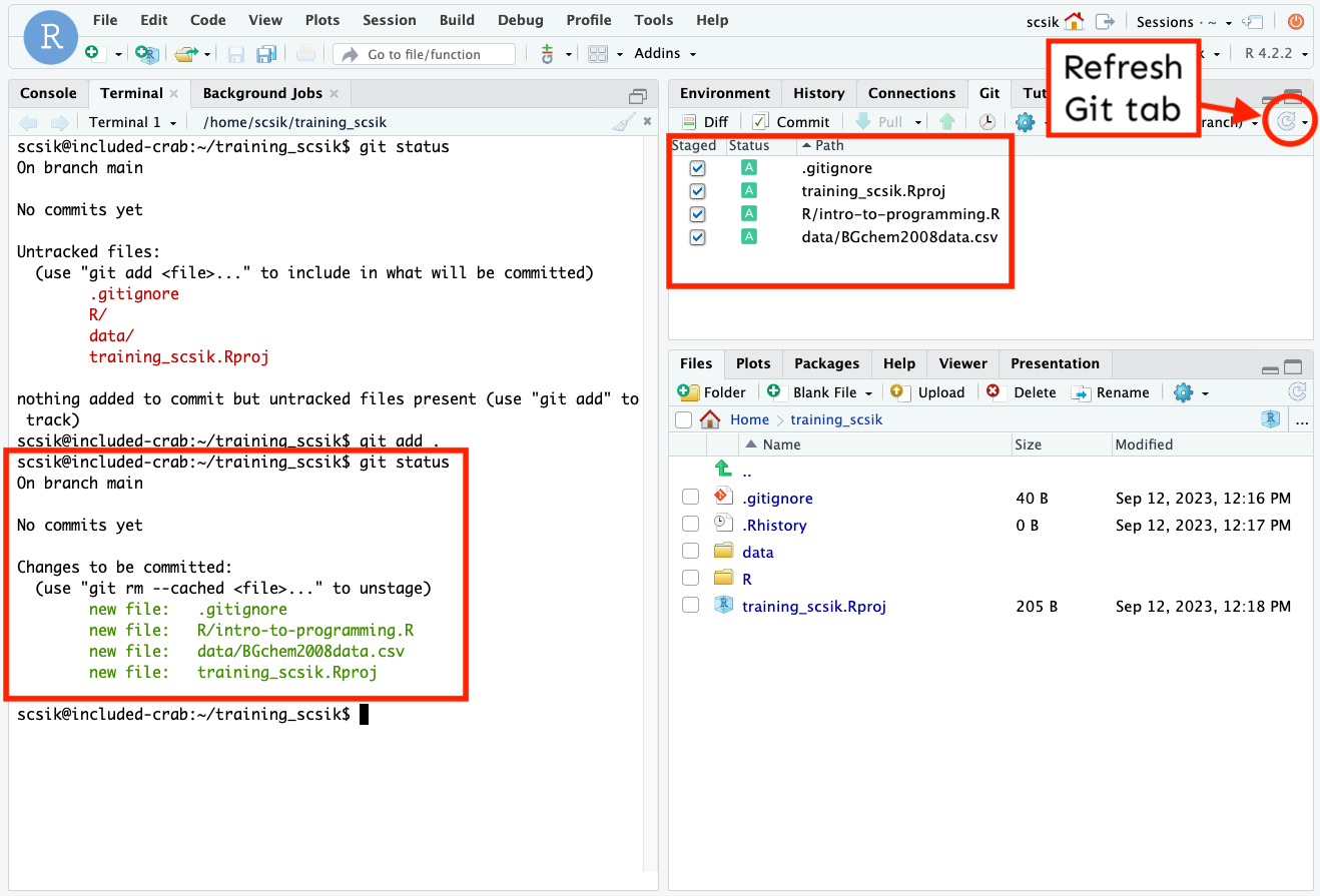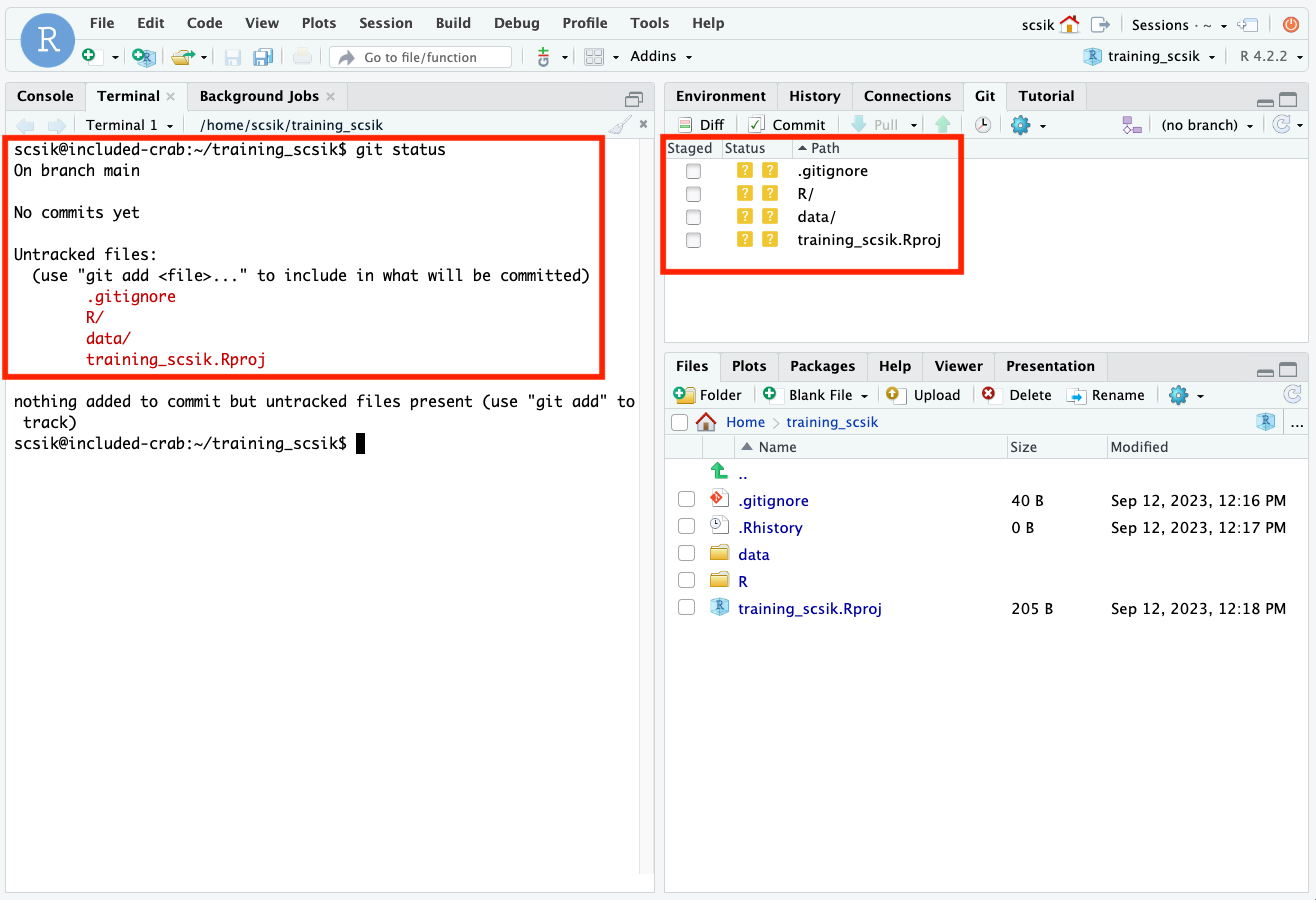 Initialized empty Git repository in /home/username/training_username/.git/You’ll likely need to help included-crab along in recognizing that this R Project has been initialized as a git repository – click Session > Quit Session… > New Session > choose training_{USERNAME} to reopen your project.