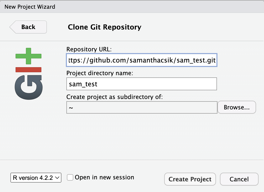 sam_test.Rproj, that is listed as untracked (denoted by ?? in the Git tab). - You should see a message at the top of the Git tab that says,