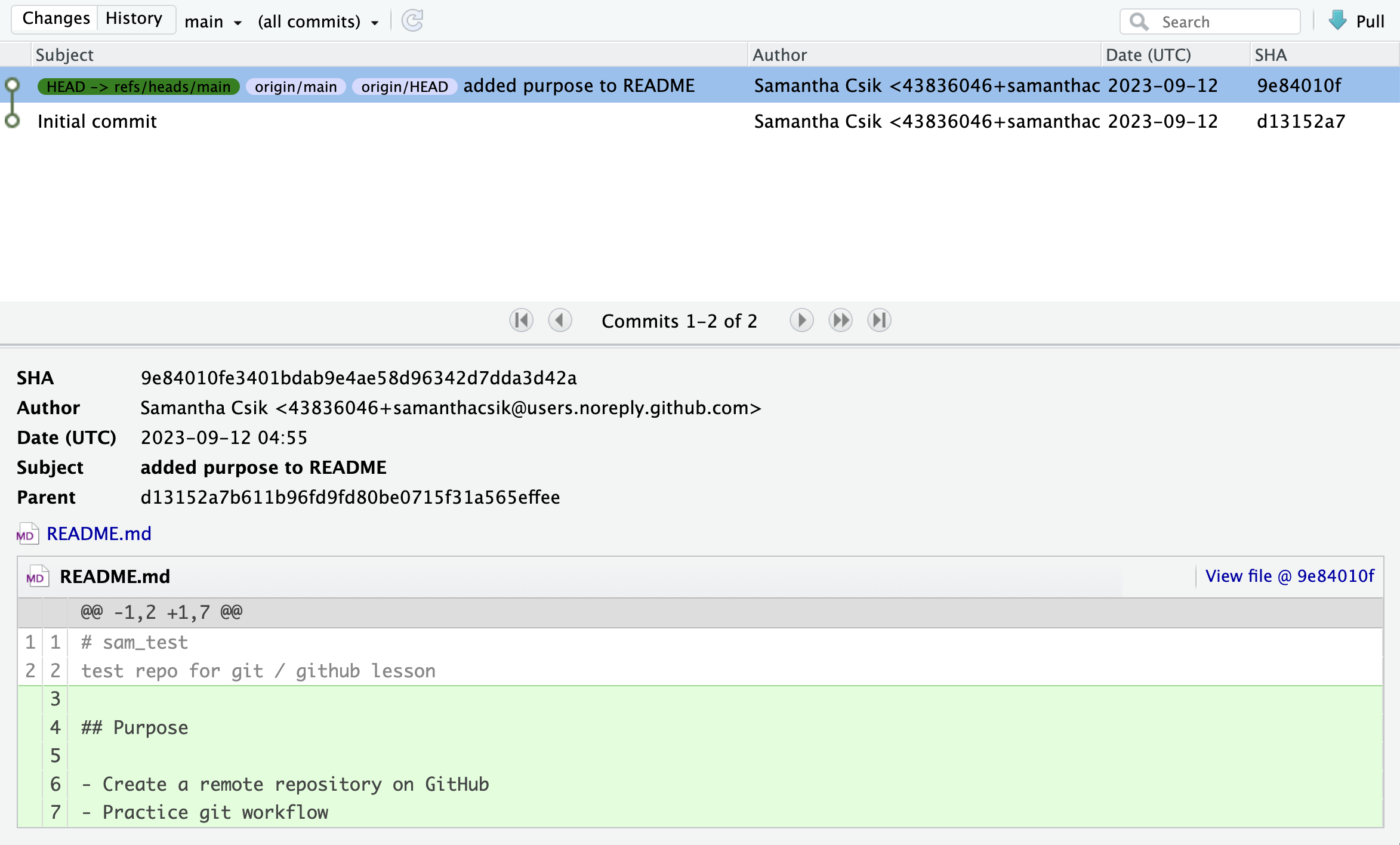 README.mdfile – this time from RStudio – then commit theREADME.mdchange - Add a new section to your