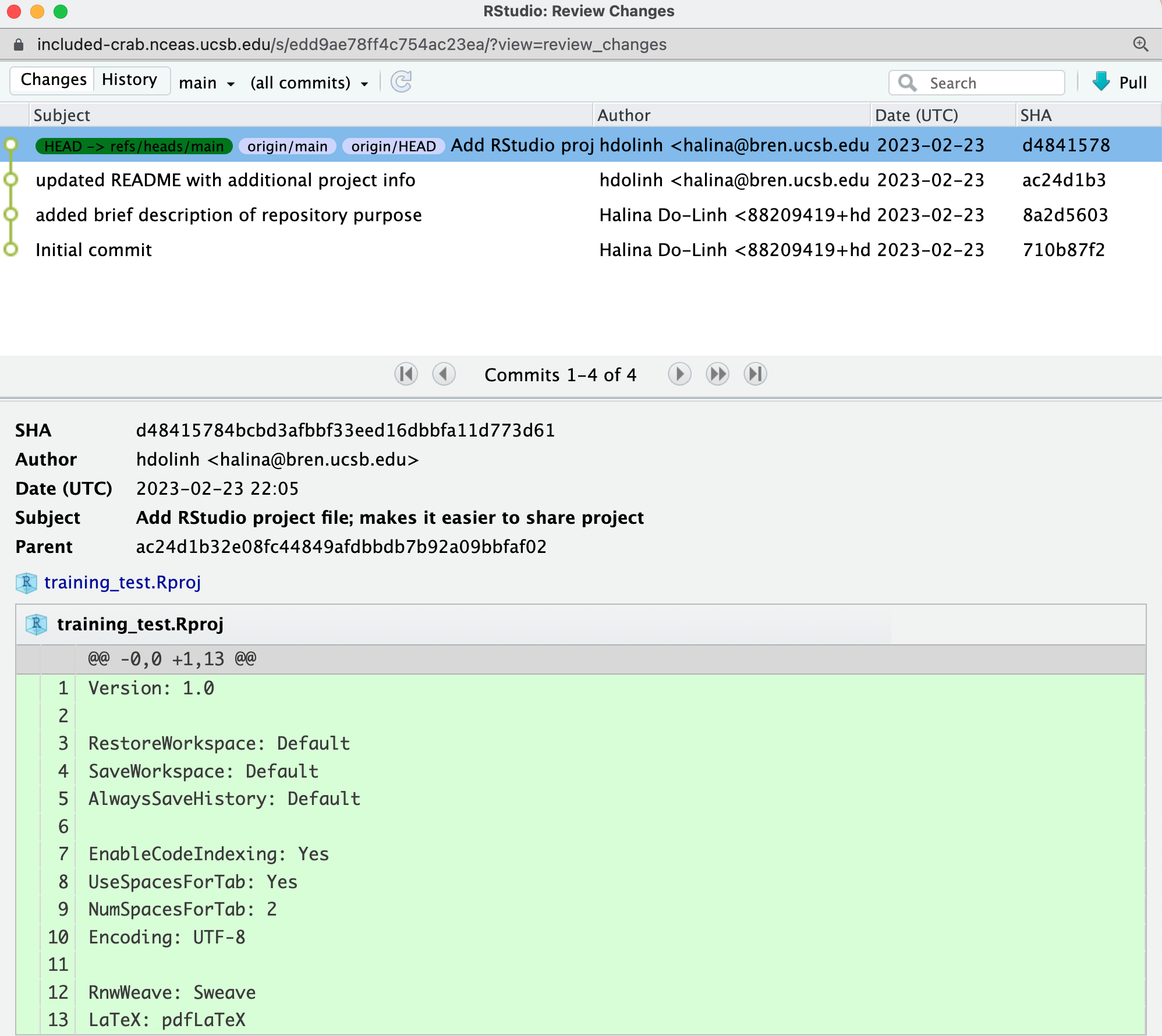 Click on the History button to see a total of four commits in the local repository (the two we made directly to GitHub via the web browser and the two we made in RStudio).