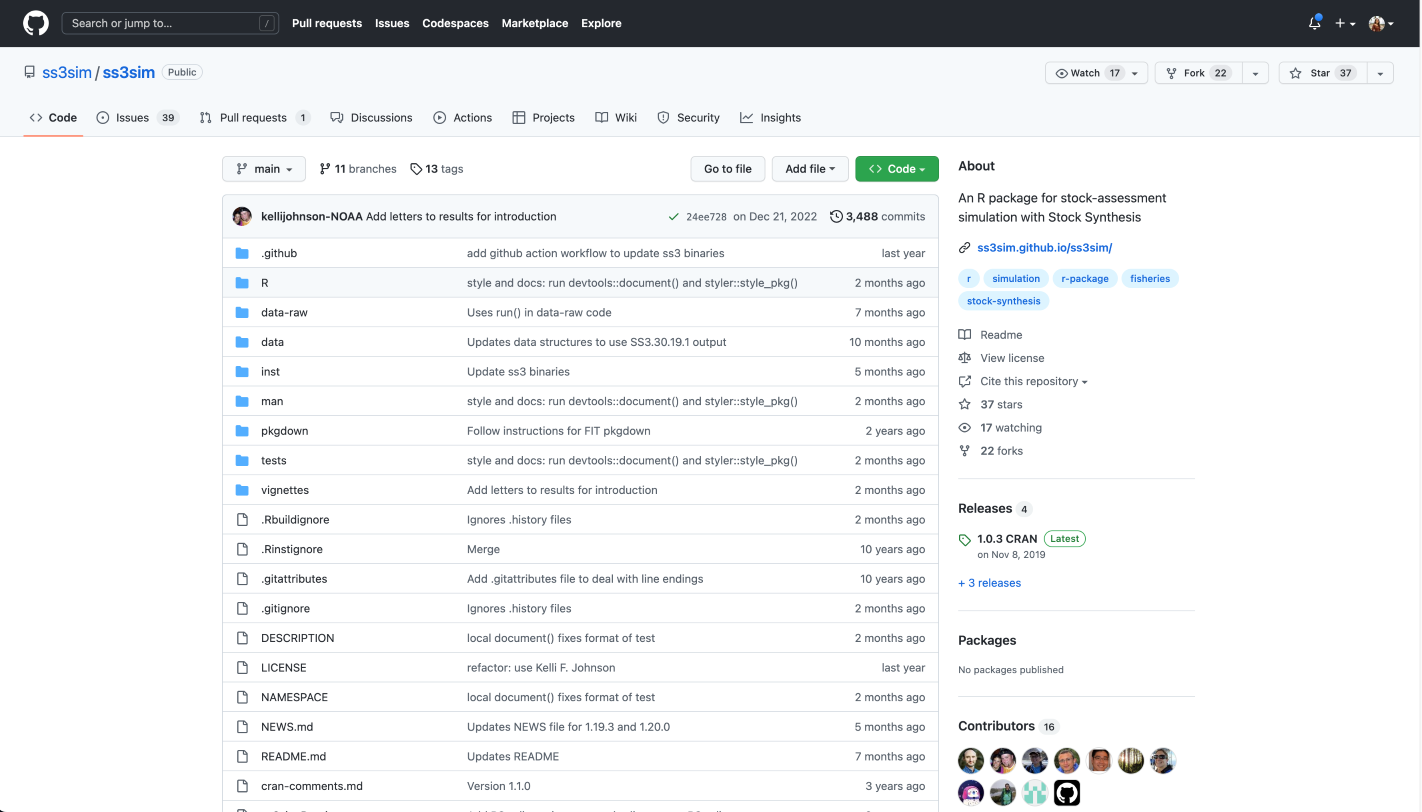 If we drill into the “commits” for the repository, we can see the history of changes made to all of the files. Looks like kellijohnson was working on the project and fixing errors in December:
