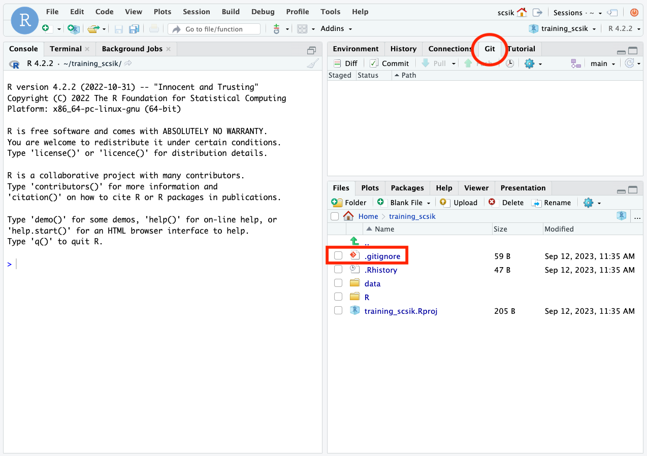 training_{USERNAME}as a Git repository by runningusethis::use_git()in the Console. Choose yes when asked if it’s okay to commit any uncommitted files. Choose yes again if asked to restart R. Once complete, you should see the Git tab appear in your top left pane in RStudio and a.gitignorefile appear in your Files tab.