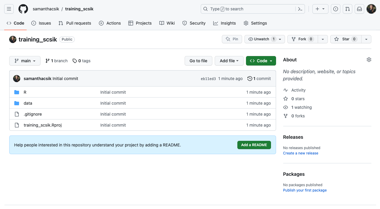 There are a few approaches for turning an existing project folder into a Git repository, then sending it to GitHub – if you’re an R-user, the simplest way is to use the {usethis} package, which is built to automate tasks involved with project setup and development. However, you can also initialize a local git repository and set the remote repository from the command line (a language-agnostic workflow). Steps for both approaches are included below (demonstrated using your training_{USERNAME} project):