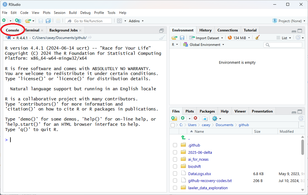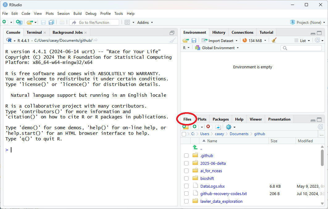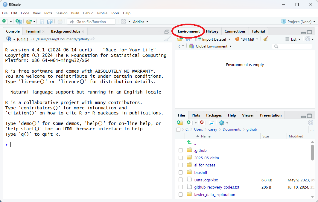 When you start a new session, the environment pane should say “Environment is empty.” As you use R to make calculations and store values, you will see objects in this pane.