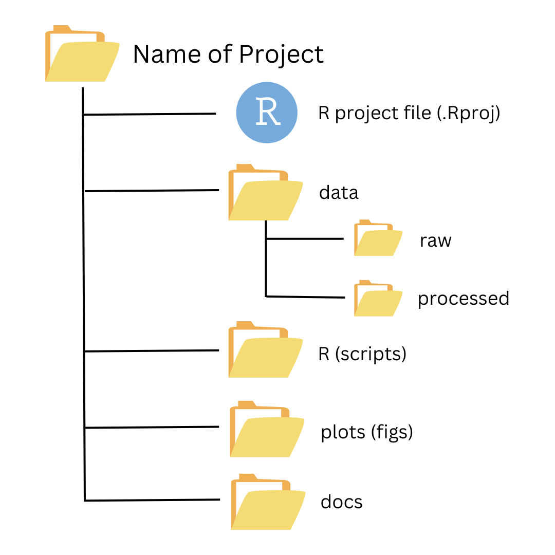 data: where we store our data (often contains subdirectories for raw, processed, and metadata data)R: contains scripts with your custom R functions, etc. (some find this name misleading if their work has other scripts beyond the R programming language, in which case they call this directoryscripts)plotsorfigs: generated plots, graphs, and figuresdocs: summaries or reports of analysis or other relevant project informationscripts:has all scripts where you clean and wrangle data and run your analysis.