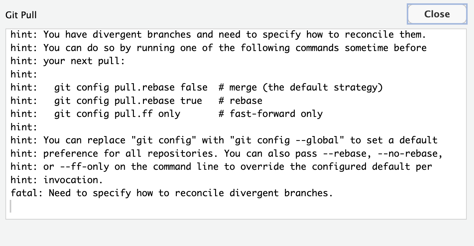 If you don’t define pull.rebase = "false" when setting the global configurations, you will have to define this for each repository you create. You will likely see the following message after you pull, meaning you have not define how to reconciling two branches in your repository.
