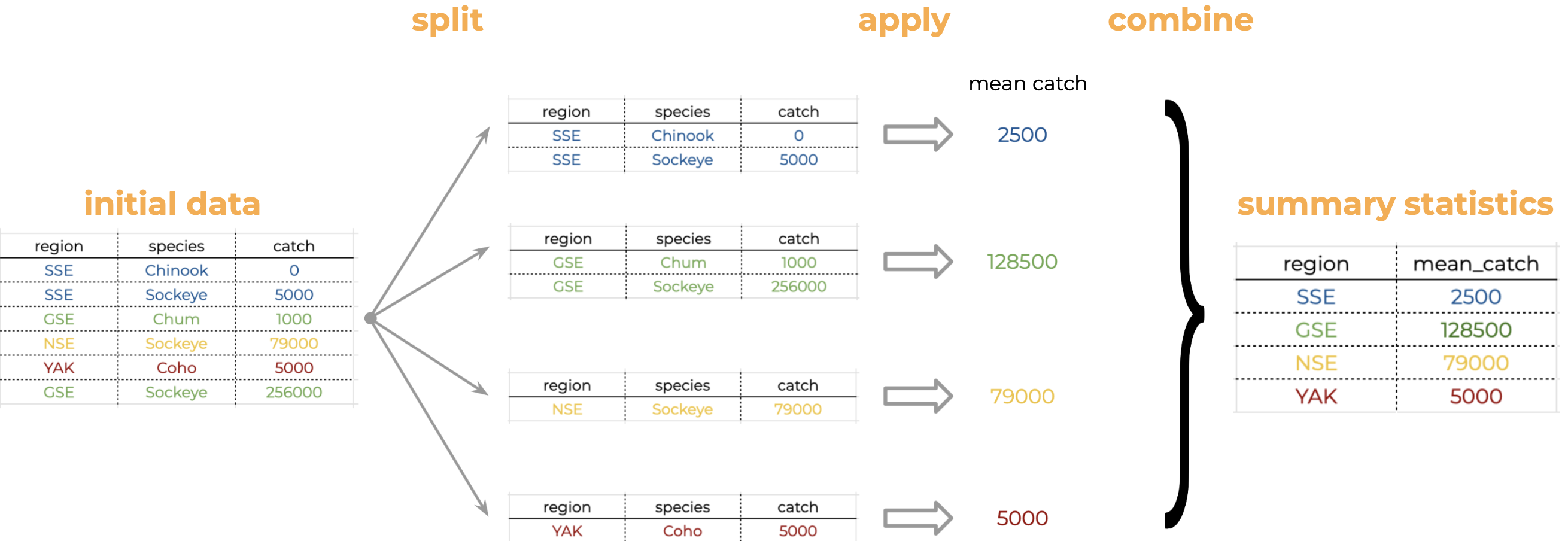 Analyses like this conform to what is known as the Split-Apply-Combine strategy. This strategy follows the three steps we explained above: