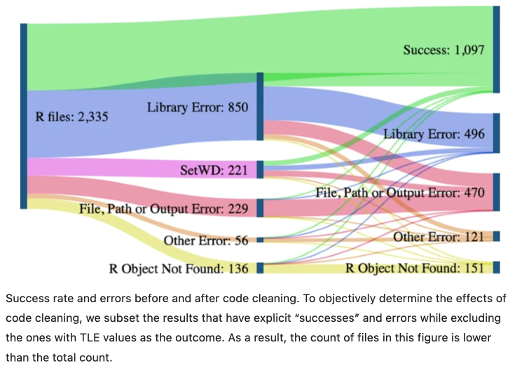 A recent study of publicly-available datasets in the Harvard Database repository containing R files found that only 26% of R files ran without error in the initial execution. 44% were able to be run after code cleaning, showing the importance of good programming practice [@trisovic2022]. The figure below from Trisovic et al. shows a sankey diagram of how code cleaning was able to fix common errors.