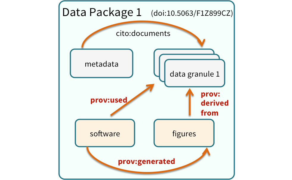 One way to illustrate this is to look into the structure of a data package. A data package is the unit of publication of your data, including datasets, metadata, software and provenance. The image below represents a data package and all its components and how these components relate to one another.