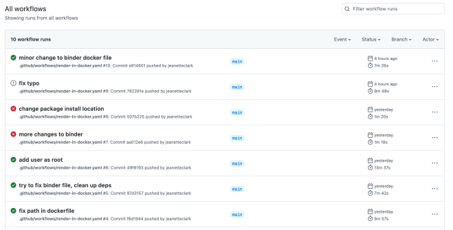 rrtools::use_dockerfile(), the package also sets up GitHub Actions for you. - Actions are processes that are triggered in GitHub events (like a push) and run automatically.