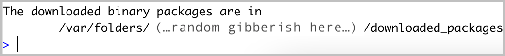install.packages("gitcreds")A lot of scary looking red text will show up while this is installing - don’t panic. If you get to the end and see something like below (with no error) it’s installed successfully.